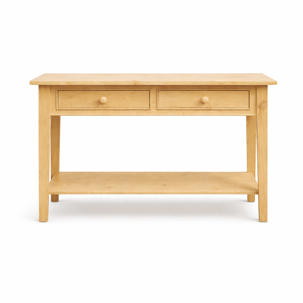 The A-Series Solid Wood Sofa Table features a simple, functional design that blends easily into classic or casual interiors. Crafted from premium solid wood, it includes a smooth rectangular top, two framed-panel drawers with wooden knobs, and an open lower shelf for added storage or display. The light natural finish highlights the warmth and beauty of the wood grain, creating an inviting presence in entryways or living spaces. Fully customizable in size, wood species, finish, and texture, this handcrafted table offers timeless practicality and everyday versatility.