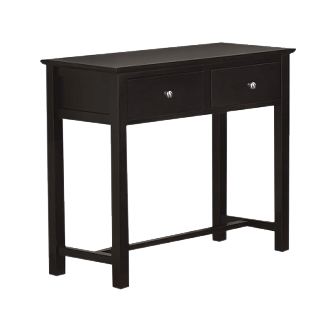 The Bancroft solid wood sofa table features a sleek and minimalist design, ideal for modern and transitional spaces. It includes a smooth rectangular top and two spacious drawers with simple round knobs for convenient storage. The slim, straight legs are supported by a stretcher base for added stability, maintaining a clean and open aesthetic. Finished in a rich, dark stain, this table exudes understated elegance. Fully customizable, it can be tailored to fit your size, finish, and design preferences.