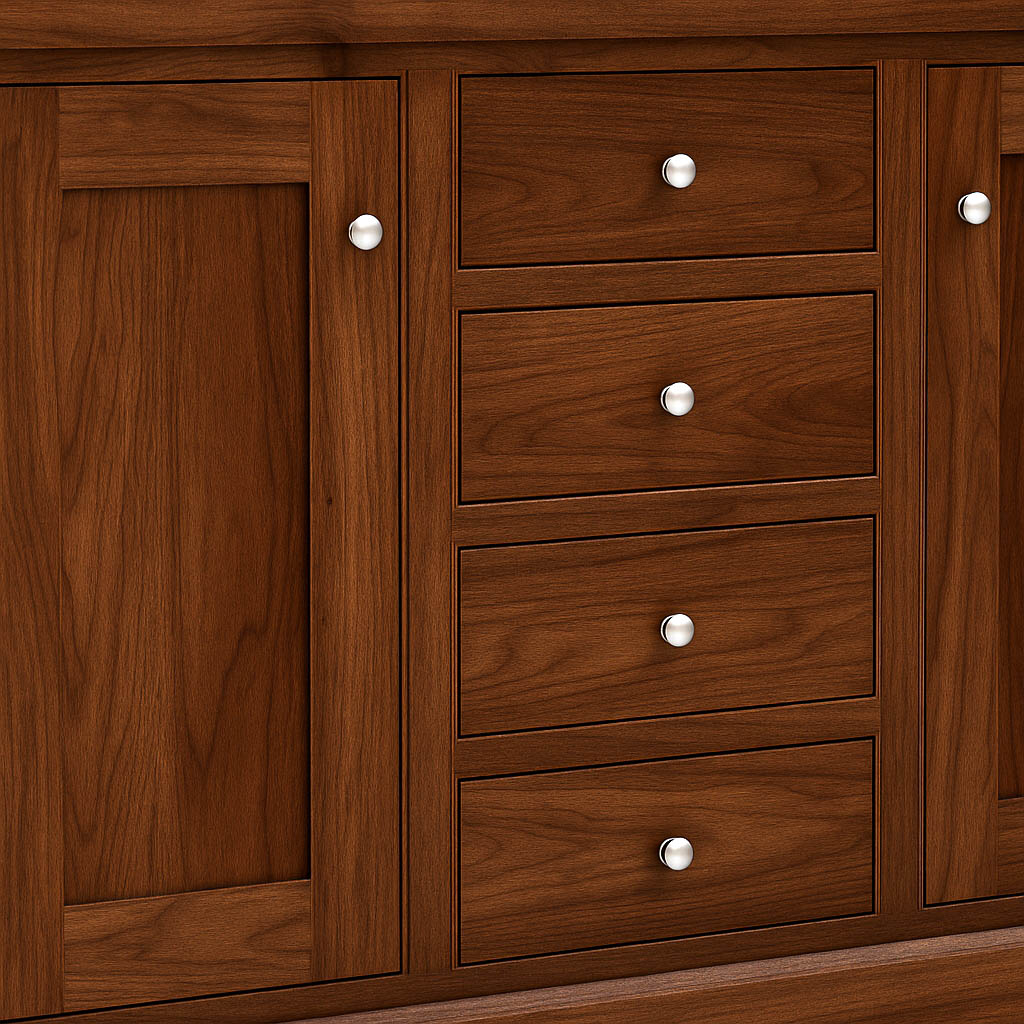 The Brentwood Solid Wood Sideboard is a beautifully handcrafted storage piece that blends classic craftsmanship with modern functionality. Built from premium hardwood, it features a clean overhung top, two spacious cabinet doors with traditional shaker-style panels, and four center drawers for organized storage. A substantial plinth base adds stability and timeless presence while the rich wood grain creates natural warmth in any room. Perfect for dining rooms, living spaces, or entryways, the Brentwood sideboard offers generous storage for serveware, linens, or everyday essentials. Custom wood species, finishes, and sizes allow this piece to be tailored to your home perfectly.