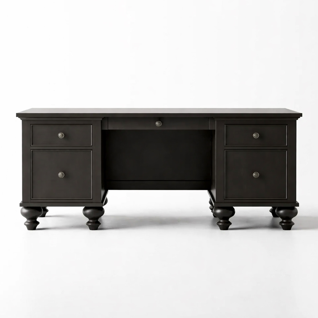 The Brooklyn Solid Wood Executive Desk brings traditional craftsmanship and strong architectural detailing to the modern workspace. Built entirely from solid wood, this desk features a generous work surface, central drawer, and dual side storage for organized functionality. Turned legs and paneled sides add character and presence, making it ideal for executive home offices or professional settings. Designed for durability and everyday performance, the Brooklyn desk offers timeless style with dependable craftsmanship.