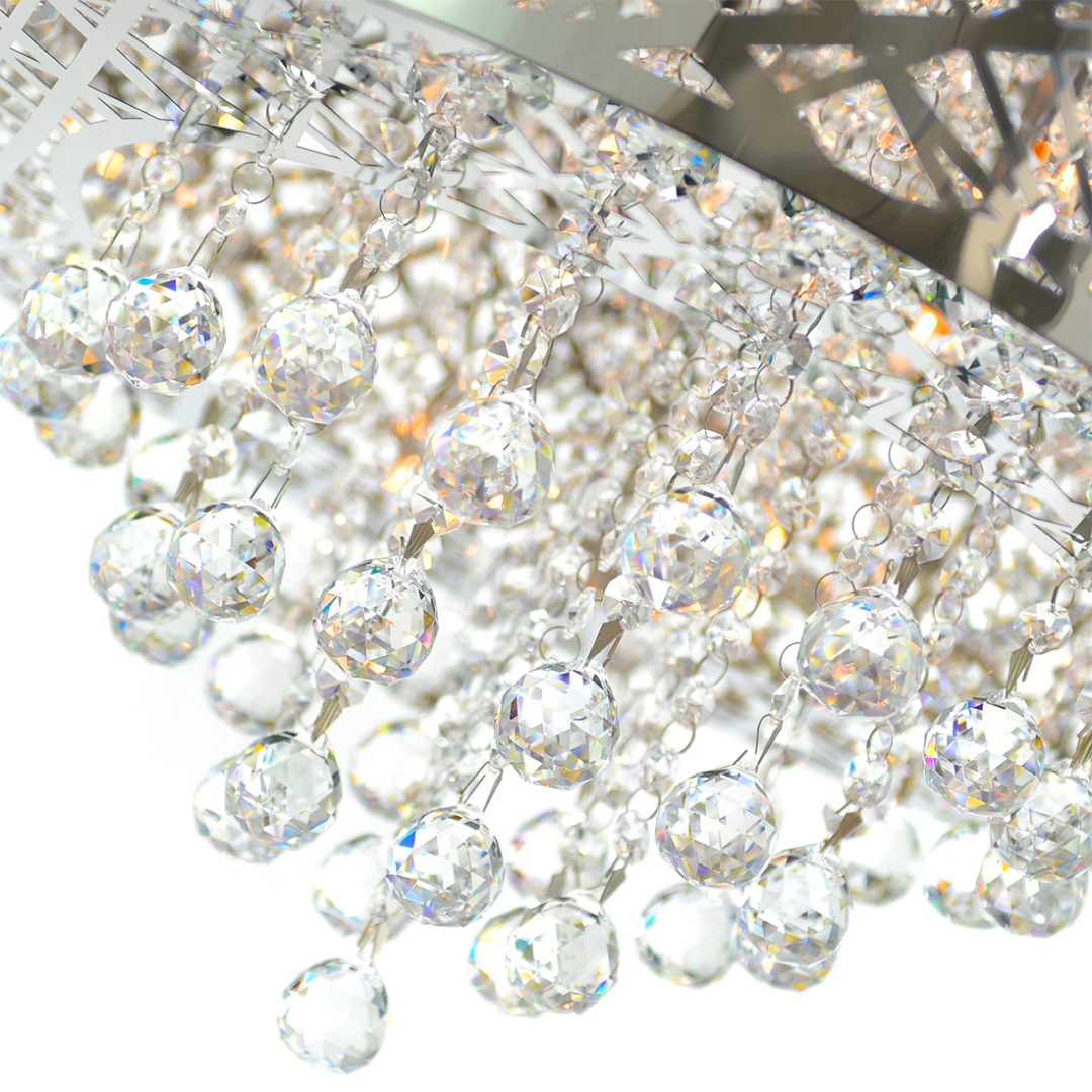 Elevate your interior with the Celestia Chandelier, a dazzling fusion of modern design and timeless luxury. Its chrome drum shade features a laser-cut geometric pattern that diffuses light beautifully, while cascading strands of faceted crystals catch and reflect light from every angle. Perfect for dining rooms, foyers, or any statement space, this modern crystal chandelier brings elegance and warmth to your décor. Designed for contemporary homes, Celestia is more than a light fixture—it’s a decorative lighting centerpiece. Brighten your space with sophistication using this chrome chandelier with crystal drops, tailored for those who appreciate artful lighting design.