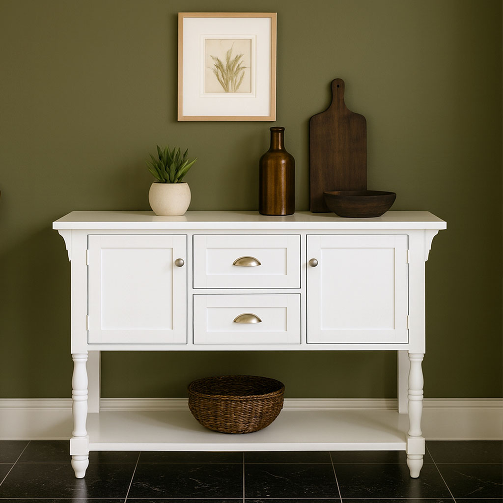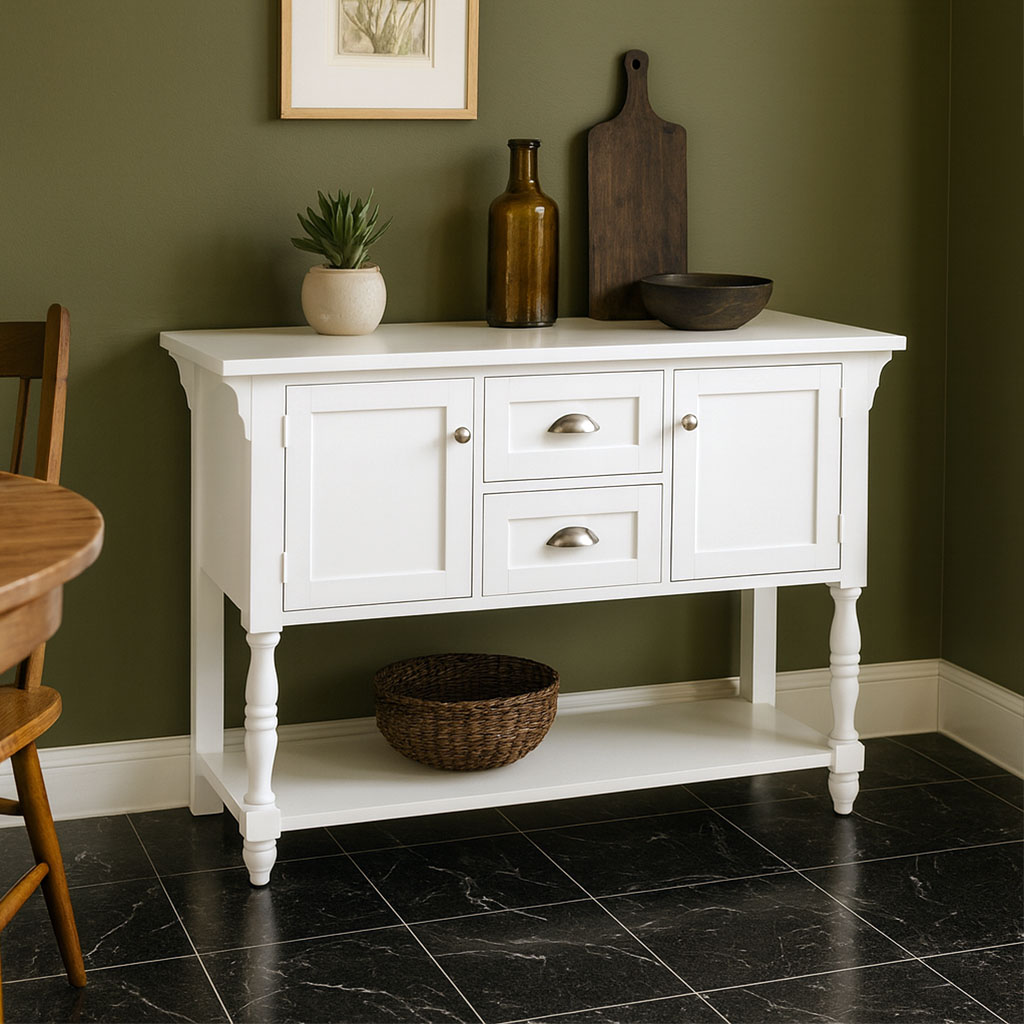 This elegant solid wood sideboard combines traditional craftsmanship with practical storage solutions. Featuring a rich, warm finish, it includes two side cabinets for concealed storage, two central drawers with stylish cup pulls, and a spacious lower shelf, ideal for displaying decor or storing larger items. The design is enhanced by intricate turned legs and classic corbel accents, adding a touch of vintage charm.