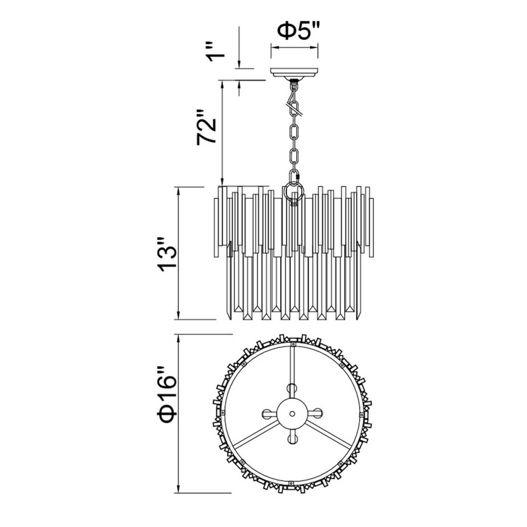 This stunning 4-light Deco Chandelier combines vintage glamour with modern flair. It features a radiant gold frame with vertical metal bars encircling clear, faceted crystal prisms that cascade down in layers. The crystals beautifully reflect and refract light, creating a dazzling display. Suspended by a gold chain, this elegant fixture is perfect for adding a touch of luxury to smaller spaces.