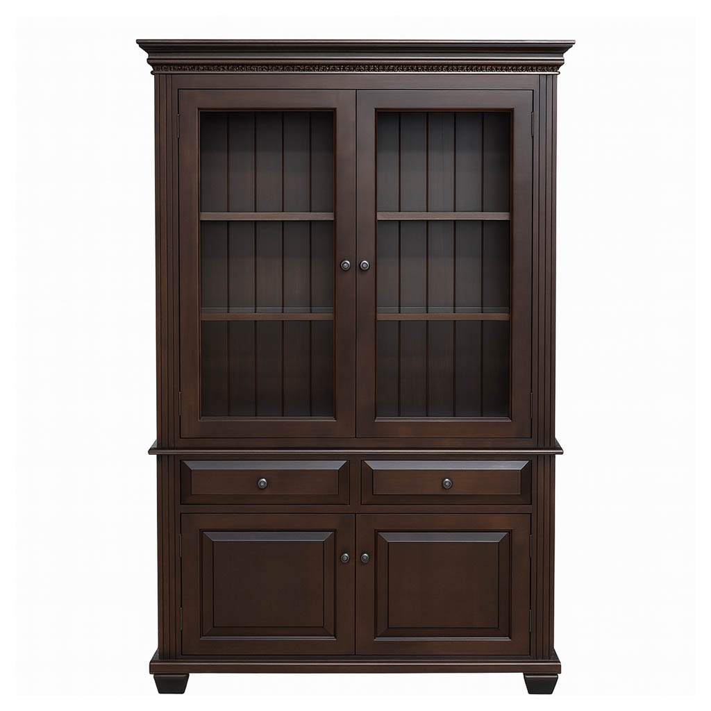 This handcrafted solid wood hutch and buffet showcases timeless classic design with exceptional storage versatility. The upper hutch features tall framed glass-panel doors, adjustable interior shelving, and open side panels that allow natural light to enhance displayed dΓ©cor or dinnerware. The lower buffet includes a row of spacious top drawers and multiple framed cabinet doors, creating ample concealed storage for linens, serveware and household essentials. Elegant moulding, clean detailing, and refined craftsmanship give the piece a sophisticated, traditional presence. Built from premium hardwood and customizable in size, wood type and finish, this hutch and buffet serves as both a functional and decorative focal point.