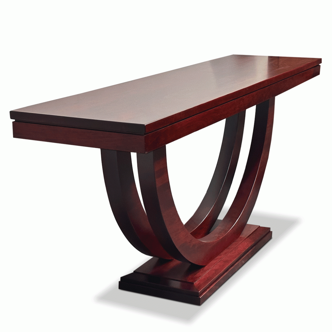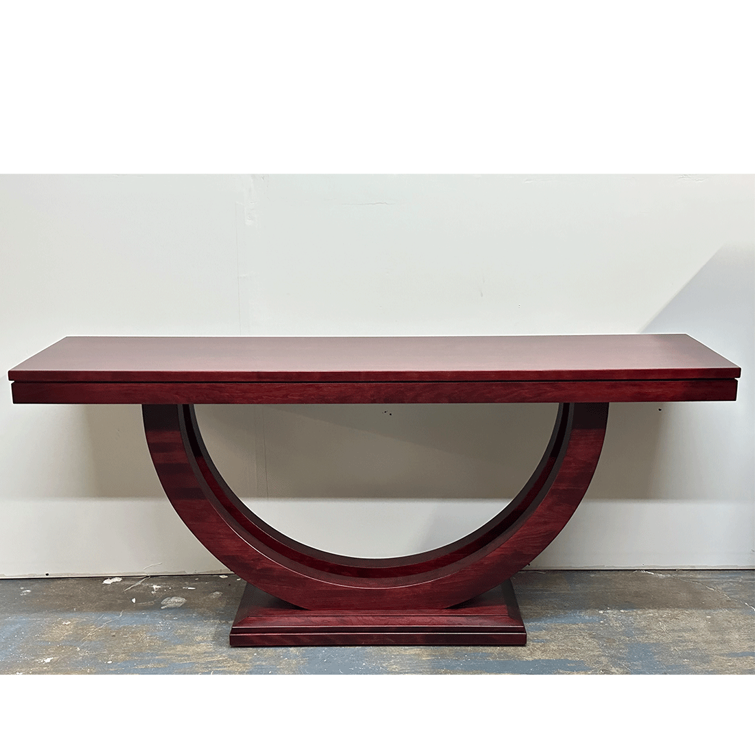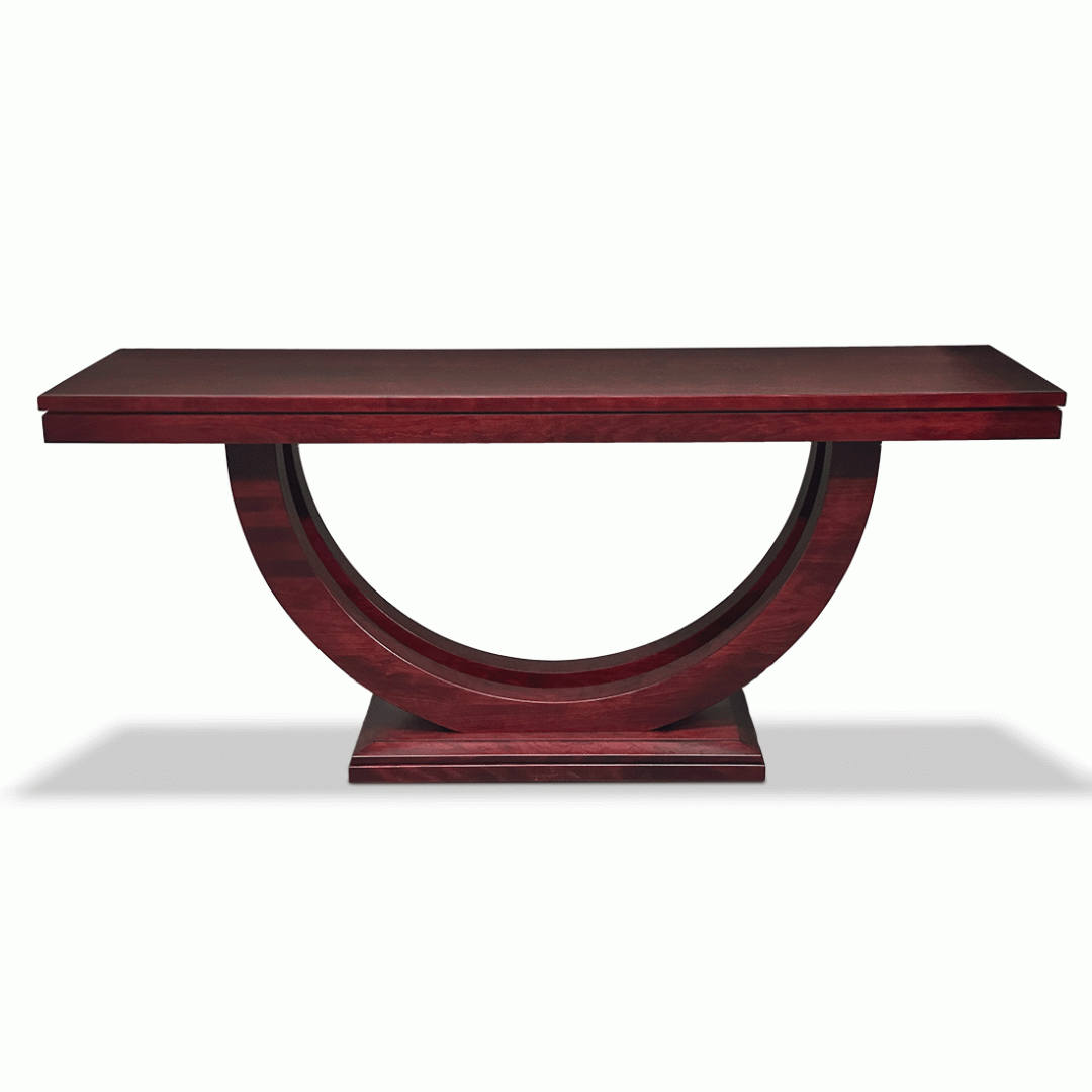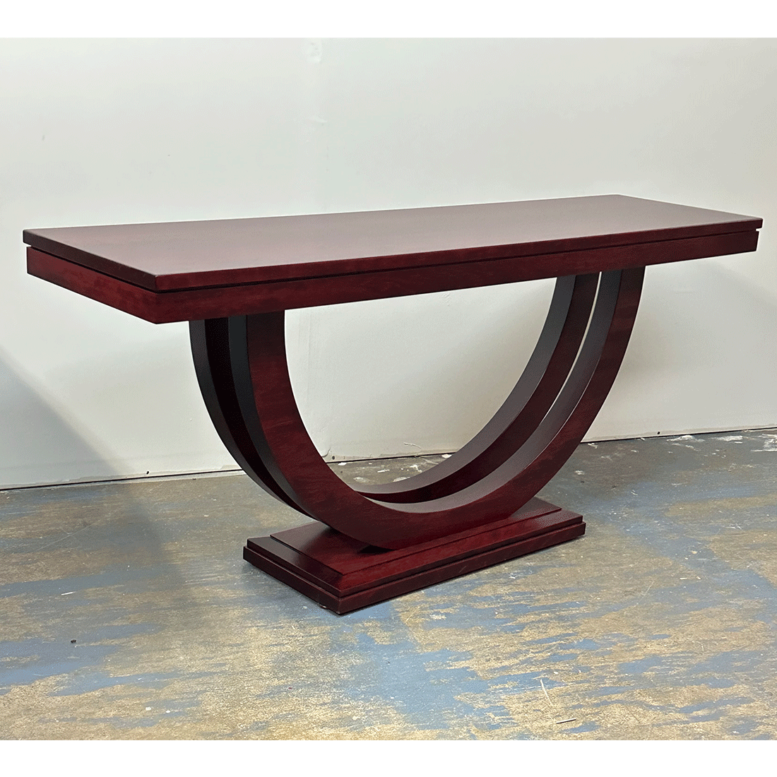 Metro server is a perfect blend of artistry and functionality. The standout feature is its gracefully curved double “U” base, which adds a sculptural element to the design while ensuring stability. The smooth rectangular tabletop provides ample surface space, making it ideal for entryways or living areas. Finished in a rich, polished tone, the wood grain is beautifully enhanced, adding warmth and sophistication. Fully customizable in wood type, finish, and dimensions, this solid wood modern sideboard serves as a stunning focal point, perfect for contemporary or transitional interiors.