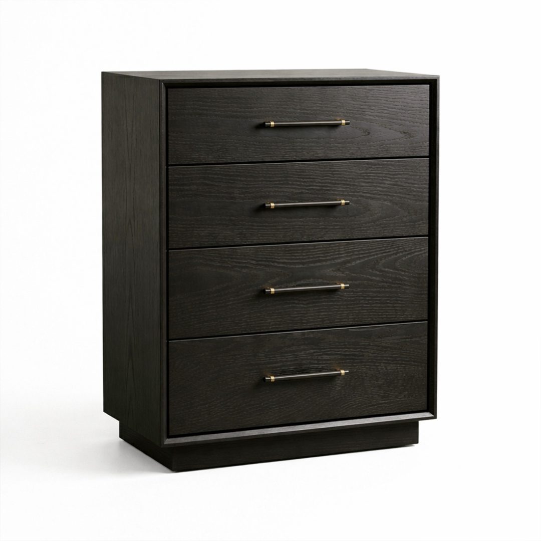 The Modera Modern Chest, Solid Wood Hiboy, Designed with clean, straight lines and a minimalist silhouette, it features five spacious drawers, each fitted with sleek metal bar handles accented with subtle gold tones. The framed drawer fronts add depth and character, while the slightly recessed base gives the piece a grounded, modern look. This chest perfectly blends mid-century inspiration with contemporary elegance, offering both generous storage and a sophisticated statement for any bedroom setting.