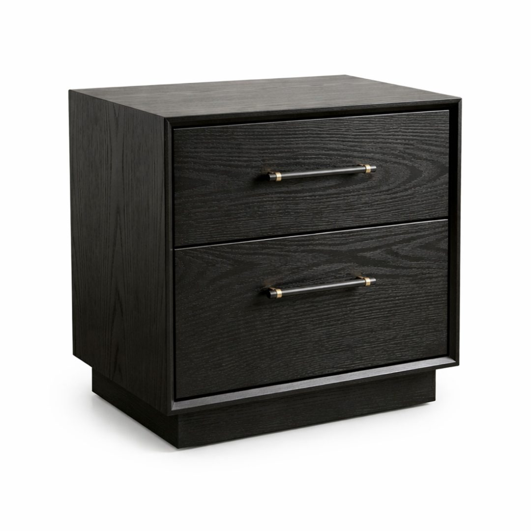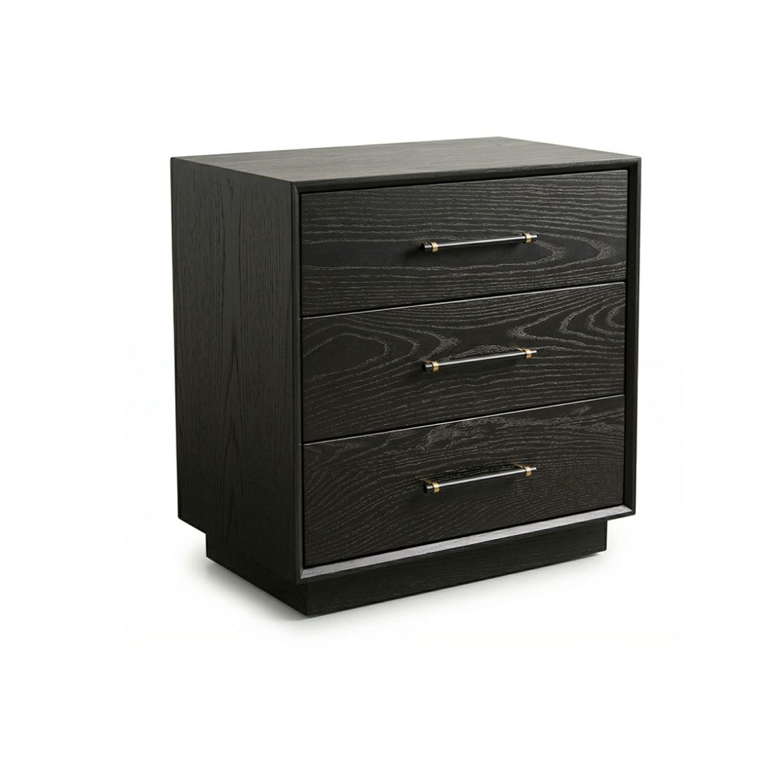 The Modera Modern Nightstand features a clean, compact silhouette enhanced by a rich dark wood finish that highlights bold natural grain patterns. Designed with simplicity in mind, it showcases smooth, flat drawer fronts framed within a subtle outer case, creating depth and a refined architectural look. Available in both two and three drawer configurations, it offers practical bedside storage while maintaining a minimalist aesthetic. Each drawer is finished with sleek metal bar handles accented with soft gold tones, adding a touch of contrast and elegance. The recessed base grounds the design, making it a timeless and versatile addition to any modern bedroom.