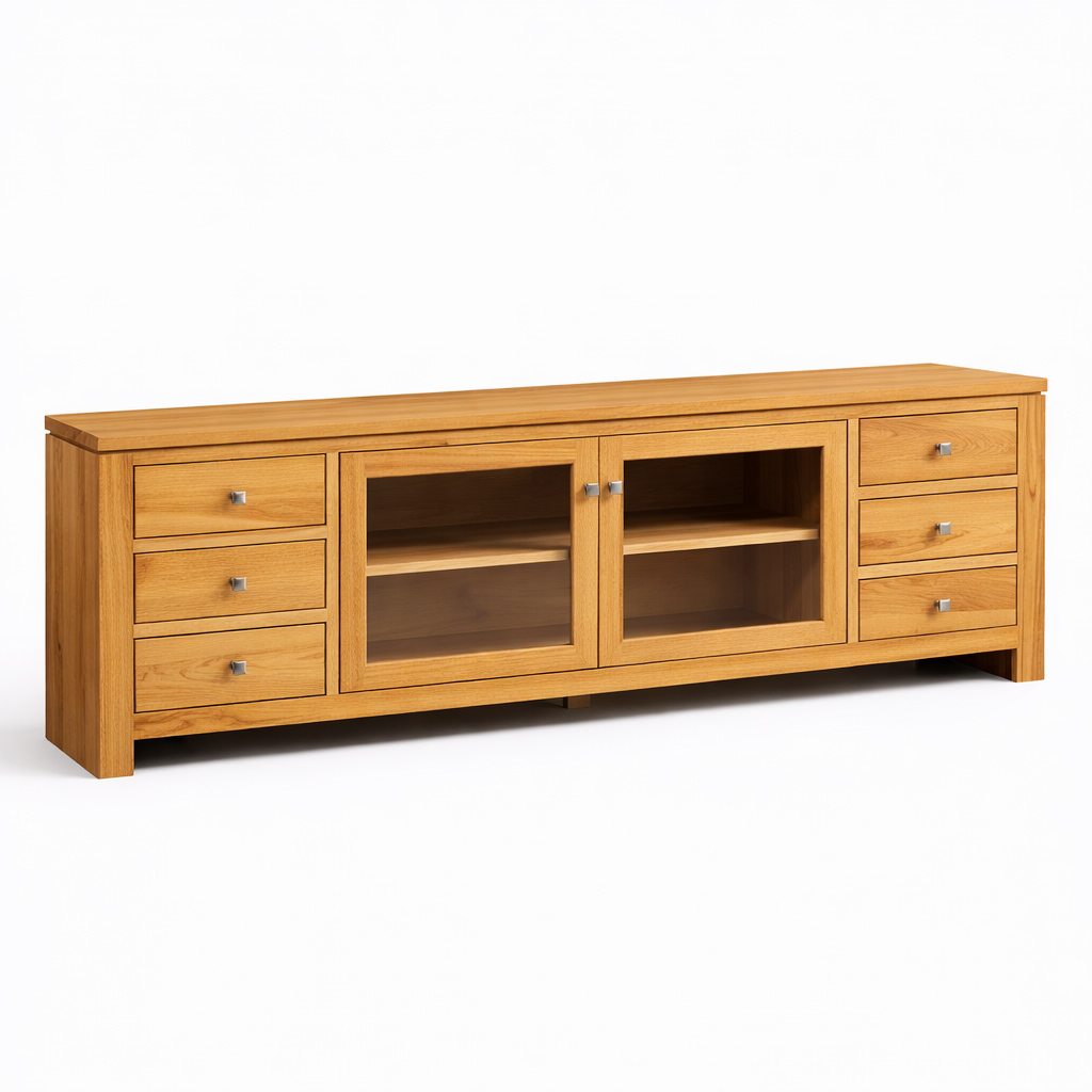 The Newport Modern TV Table brings sleek contemporary design to classic hardwood construction. Crafted from solid wood with a refined modern profile and tapered legs, this entertainment console features open shelving for media components and spacious lower drawers for concealed storage. Its clean lines, warm wood grain, and versatile proportions make it a perfect fit for modern and transitional living rooms alike. Available in a range of finishes and wood species, the Newport TV table combines style and functionality to anchor your media setup with lasting quality.
