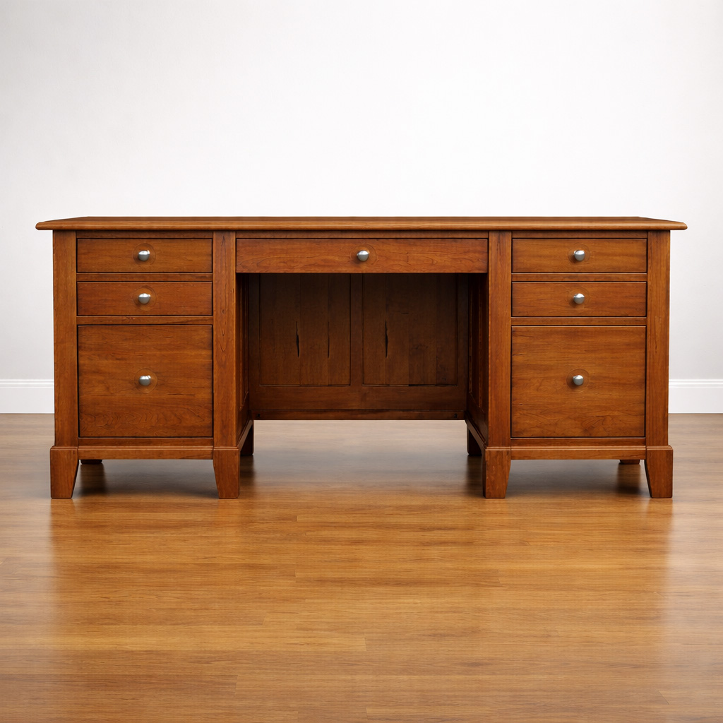 The Phillipe Solid Wood Executive Desk is designed for professional workspaces that demand both presence and practicality. Crafted entirely from solid wood, this desk features a wide work surface, central pencil drawer, and dual drawer banks for efficient organization. Its balanced proportions, paneled construction, and warm wood finish create a timeless executive look suitable for home offices or private studies. Built for durability and daily use, the Phillipe executive desk delivers classic craftsmanship with dependable functionality.