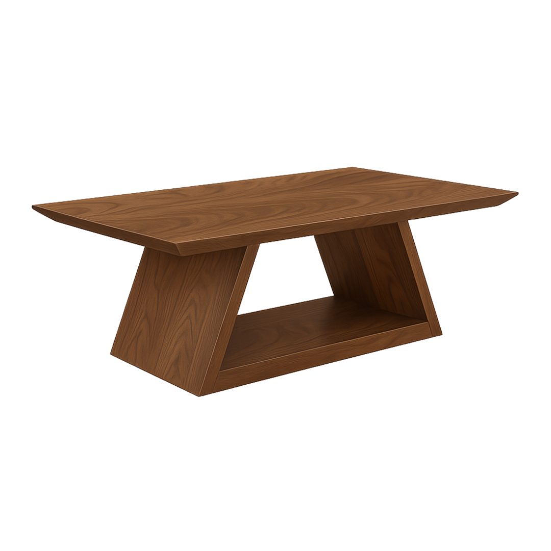 The Shard Solid Wood Coffee Table features a modern, geometric design with a warm, natural wood finish that highlights the grain. The rectangular top has slightly beveled edges, giving it a refined yet contemporary look. Its base consists of two angled wooden panels that slant inward, creating a striking V-shaped profile on each side and adding an architectural element to the piece.