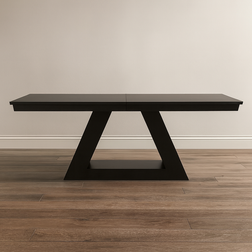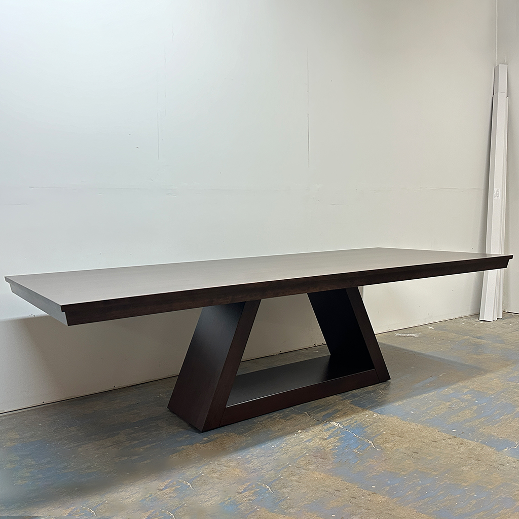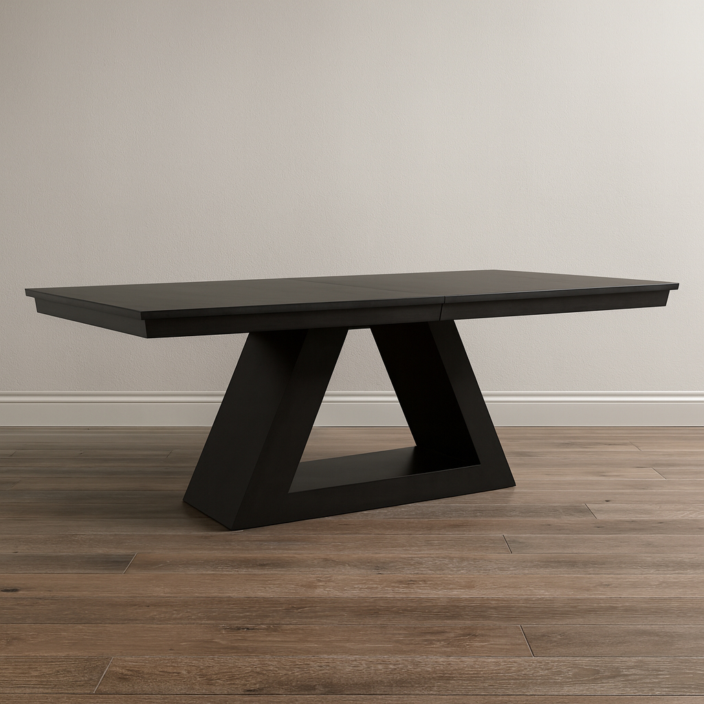 The Shard Solid Wood Dining Table features clean modern lines and crisp mitered angles paired with a striking double-pedestal base supporting a sleek solid wood top that highlights rich natural grain and architectural presence. Handcrafted in Canada and made-to-order, it offers customizable sizes, wood species like Maple, Oak, Walnut or Pine, and a range of stain finishes to suit your space. Whether used for daily meals or gatherings, this extendable table blends contemporary warmth with enduring craftsmanship designed to last.