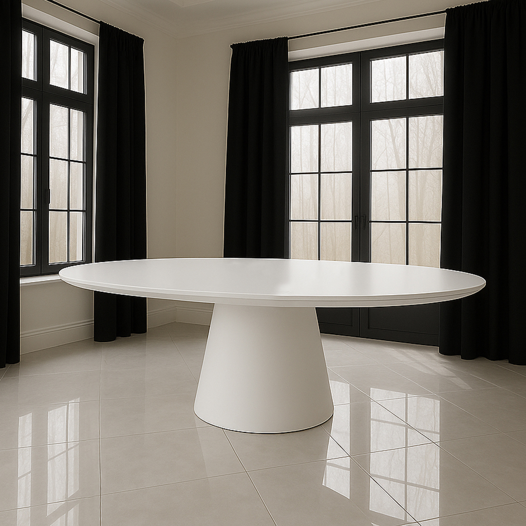 The Statland Solid Wood Dining Table blends timeless design with Canadian craftsmanship. With its sculptural pedestal base and customizable round or oval top, this table is handcrafted from premium hardwoods and built to become the heart of your dining space.