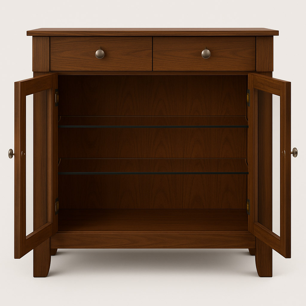 - 2 Drawers and 2 Glass Doors with 2 glass shelves behind – 45″W x 19″D x 42″H