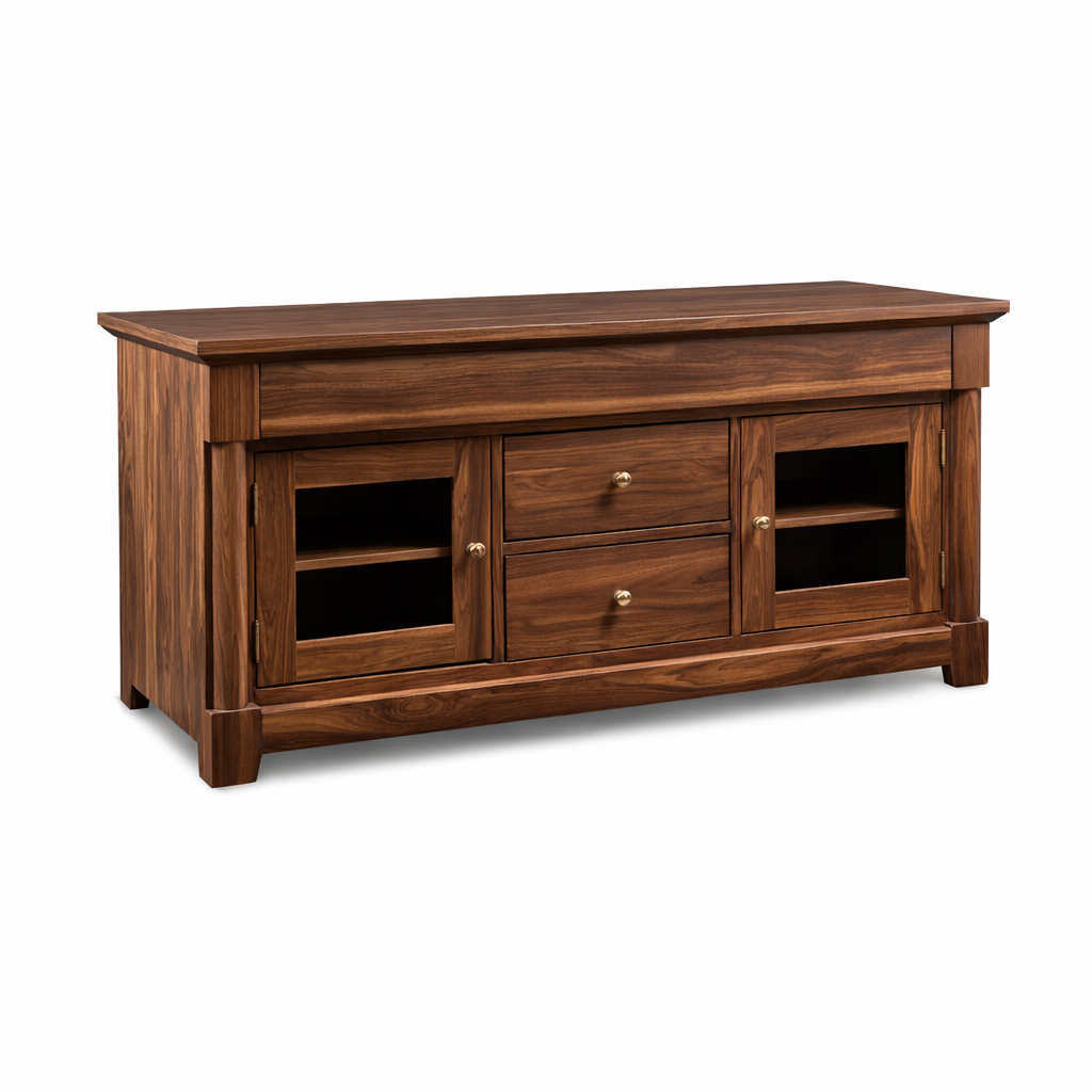 The Tranquil Solid Wood TV Table combines timeless craftsmanship with practical storage for your living room. Made from premium hardwood and finished with a classic crown molding detail, this TV stand offers an open central area for your TV and media components, paired with side cabinets for concealed organization. Its balanced proportions and rich wood grain make it a refined foundation for any entertainment setup. Available in customizable stains and wood species to suit your décor, the Tranquil TV Table brings both enduring style and functional versatility to your home.